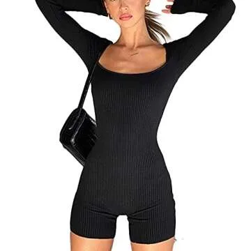 Muineobuka Ribbed Knit Bodycon Short Jumpsuit Long Sleeve Square Collar Sport Biker Short Rompers (Black, Medium)