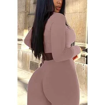 Mulisky Women’s Casual 2 Piece Outfits Sexy Bodycon Long Sleeve Crop Top with Long Pants Tracksuit Set Jumpsuits Apricot S