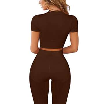 Mulisky Workout Sets for Women 2 Pieces Ribbed V Neck Zipper Yoga Crop Top with High Waist Leggings Exercise Outfits Brown M