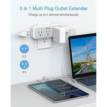 Show more Introducing the TESSAN Multi Plug Outlet Extender – a versatile and compact solution to all your power needs! This surge protector wall plug splitter accommodates the standard North American 2 or 3 prong flat pin plugs, allowing you to effortlessly connect multiple devices at once. With its ingeniously crafted layout, this outlet expander can hold up to five plugs simultaneously while maintaining a neat and tidy space, making it ideal for busy homes, dorm rooms, offices, or during travel.