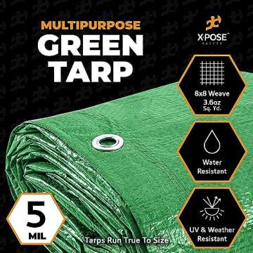 Show moreIntroducing the Multipurpose Protective Cover Green Poly Tarp 5' x 7' by Xpose Safety, designed to provide ultimate protection for your belongings in any condition. Made from high-quality, 5 mil thick polyethylene, this lightweight tarpaulin is the ideal cover for a wide range of uses, from securing equipment and machinery on construction sites to protecting your furniture from paint splatter during renovations. Its amazing versatility means you can easily cover cars, boats, grills, and even roofing with ease. Whether you're facing heavy rain, snow, or intense sunlight, this tarp stands ready to defend your assets against the elements.