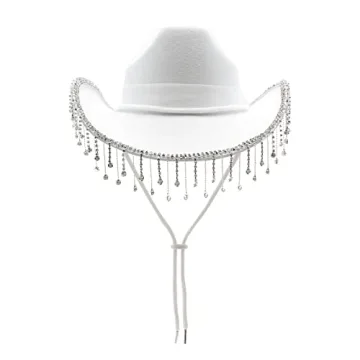 Show moreStep into the spotlight with the MUMUWU Cowgirl Hat with Rhinestone Fringe, a stunning accessory designed for the confident and stylish woman. Crafted to elevate any outfit, this wide-brimmed western-style cowboy hat features a chic rhinestone tassel that effortlessly adds spark and glamour to your look. Its adjustable rope ensures a comfortable fit for most women's head circumferences of 22-22.8 inches (56-58 cm). What truly sets this hat apart is its versatile functionality: it features a chin strap that keeps it secure, allowing you to enjoy festivals and parties without worry. When not in use, you can easily drape it behind your back as a trendy decoration. Perfect for sunny days or vibrant nights, this hat is a must-have accessory for every fashionable woman.