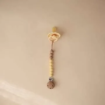 Show moreThe Mushie 100% Silicone Baby Pacifier Clip in the elegant muted yellow shade is the ultimate accessory for discerning parents looking for a stylish yet practical solution to keeping their babies’ pacifiers within reach. Crafted from 100% food-grade silicone, this pacifier clip not only ensures safety for your little one but also combines durability and functionality, making it a must-have for families on-the-go. Featuring a faux wood silicone clasp, this contemporary design elevates traditional pacifier clips to a modern accessory, adding a touch of sophistication to any outfit.