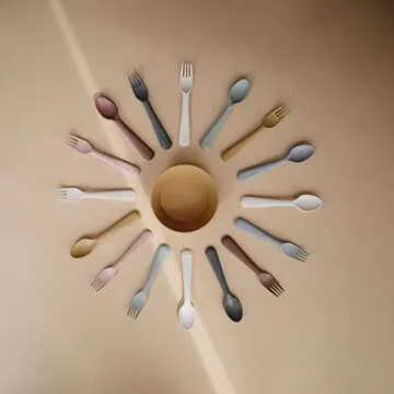 With soft colors and clean design, this plastic flatware fork and spoon set is simple and elegant—and easy for your toddler and child to hold.