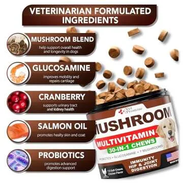 Show moreIntroducing the Mushroom for Dogs - 170 Chews, a premium multivitamin supplement specially crafted to boost your furry friend's health and vitality. Our unique blend features 30-in-1 Dog Mushroom Multivitamin Chews that include powerful ingredients such as Turkey Tail, Lions Mane, Reishi, and Maitake mushrooms, specifically selected for their health-enhancing properties. Enriched with 6 probiotics, Omega-3 rich salmon oil, and glucosamine, these chews promote not just immunity, but also joint health, energy, and gut wellness, providing a comprehensive approach to your dog’s overall wellbeing. Made in the USA, our chews are a delicious addition to your dog’s diet, making healthy living even tastier!