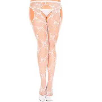 Music Legs Women's Plus Size Black Bow Lace Suspender Pantyhose for Curvy Ladies