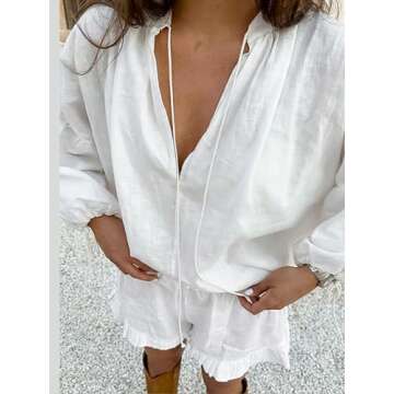 Show more Introducing the Mxiqqpltky Linen Shorts Sets for Women – the epitome of casual elegance designed for the modern woman. Crafted from high-quality polyester, this lightweight and breathable outfit offers exceptional comfort, making it your go-to choice for the summer. Say goodbye to heavy fabrics and hello to a soft-to-touch, stylish two-piece set that ensures you look great while lounging or out and about. The ensemble features long puff sleeves and a chic tie-front v-neck shirt that both flatters and adds a touch of sophistication to your look. The matching ruffled elastic high waist boxer shorts include practical pockets, combining style with functionality.