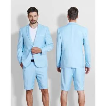 MY'S Men's 2 Piece Slim Fit Suit, One Button Blazer and Short Pants Set with Tie Light Blue