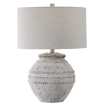Show moreIlluminate your living space with the MY SWANKY HOME Large Rustic Old World Stone Gray Ceramic Table Lamp, a truly exquisite piece that showcases the artistry of handcraftsmanship. Standing at 25.5 inches high, with an 18-inch diameter and a weight of 17 lbs, this lamp exudes a sturdy yet elegant presence in any room. Made from a combination of premium steel, cement, and ceramic, it boasts durability alongside its charming aesthetics. With a heavily distressed stone ivory finish complemented by aged gray undertones and brushed nickel-plated details, this lamp seamlessly blends rustic charm with old-world sophistication. The off-white linen fabric hardback drum shade adds a warm glow, making it the perfect fixture for cozy evenings and vibrant gatherings alike.