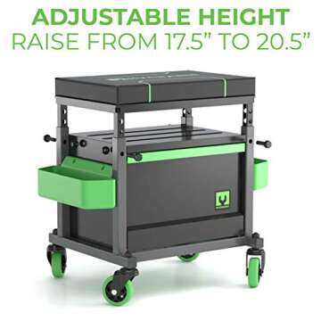 Show moreIntroducing the MYCHANIC Garage Rolling Toolbox Stool, your ultimate companion for both DIY enthusiasts and professional mechanics alike! This innovative Sidekick Stool (model SK3) not only boasts a strikingly rugged design but is also built for functionality and comfort. With an adjustable height feature, the cushioned seat transitions from 17.5" to 20.5", ensuring you can find the perfect height to suit any task at hand. Crafted with a sturdy powder-coated steel frame, this stool is built to support up to an impressive 500 pounds, making it both durable and reliable for all your garage projects.