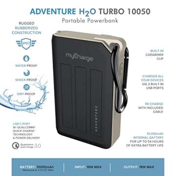 The myCharge Portable Charger is the ultimate companion for adventurers who need reliable power on-the-go! Designed specifically for outdoor activities and rugged environments, this Waterproof USB C Power Bank boasts an impressive 10,050mAh internal battery that provides up to 5x extra battery for your essentials. With 18W fast charging technology, you can efficiently recharge your cell phone, tablet, Bluetooth speaker, e-reader,...