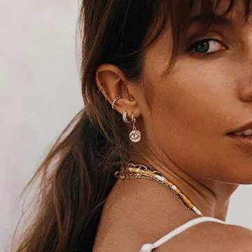 Show moreIntroducing the ultimate blend of style, elegance, and comfort with the **MYEARS Women Evil Eye Earrings**. These gold huggie hoop earrings are exquisitely designed with a unique coin disc featuring dazzling cubic zirconia, offering a touch of sophistication to everyday jewelry wear. Crafted from 14K gold plating, these earrings deliver not only a stunning visual appeal but also hypoallergenic properties, ensuring comfort for sensitive ears. Their minimalist yet trendy design makes them a versatile accessory that complements any outfit, from casual to formal, making every occasion a bit more special.