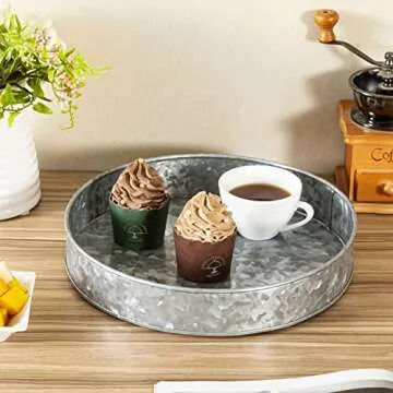 Show moreIntroducing the MyGift 11 Inch Farmhouse Galvanized Metal Round Serving Tray, a beautifully crafted piece that exemplifies rustic charm and functionality. Made with love and care, this tray is proudly handcrafted in India, ensuring each piece carries a unique touch. With an elegant galvanized finish, this versatile tray serves as both a stunning platter for serving appetizers, cheese, and charcuterie boards as well as a decorative centerpiece for your home. Its round design and 1.9 inch height make it perfect for any tabletop, adding an artistic flair to your décor.