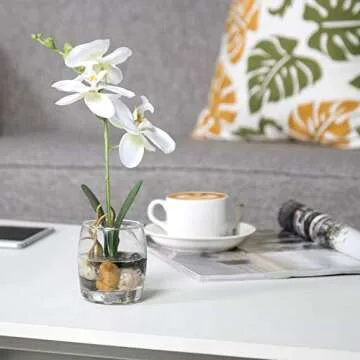 Show moreExperience the allure of nature in your home with the **MyGift 12-Inch Synthetic White Silk Artificial Phalaenopsis Orchid in Glass Vase**. This stunning artificial orchid beautifully captures the elegance of real orchids without the hassle of upkeep. Each bloom showcases a lifelike design, crafted meticulously from premium artificial silk, ensuring a lasting display of beauty. Set in a crystal-clear mini glass vase, the arrangement includes faux water and natural-looking rocks to enhance its realistic appearance. Measuring approximately 12.25 inches in height, with the vase standing at 3.25 inches tall and 2.5 inches in diameter, this charming décor piece perfectly fits any tabletop, shelf, or countertop setting, making it an ideal addition to your living space.
