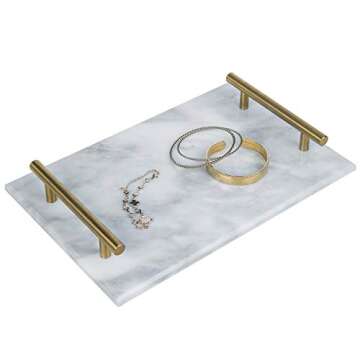 MyGift 12-Inch White Marble Stone Serving Cheese Tray/Decorative Vanity Jewelry, Makeup, Perfume Tray with Vintage Brass Metal Handles