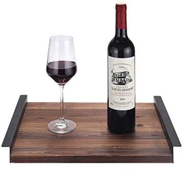 Show more Transform your serving experience with the MyGift 17 Inch Rustic Burnt Wood Finish Serving Display Tray. This stunning piece is thoughtfully designed, combining the warmth of natural wood with the sleekness of modern industrial accents. Its burnt wood finish gives it a unique character that stands out at any gathering, whether you’re serving appetizers at a party, breakfast in bed, or displaying decorative items in your home. The well-crafted black metal handles not only enhance the tray's aesthetic but also provide a sturdy grip, ensuring easy transport.