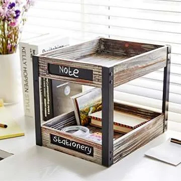 Show moreTransform your workspace with the MyGift 2 Tier Torched Wood Desktop Document Organizer! This stunning item is designed for those who appreciate both style and functionality, merging a lovely industrial aesthetic with a cozy farmhouse vibe. Made from a unique blend of metal and distressed torched wood, it offers durability alongside elegance, making it a perfect fit for any decor. With dimensions of approximately 10.6 L x 13.8 W x 11.1 H inches, this organizer features two spacious stacked trays that are perfect for accommodating folders, files, notepads, and all essential documents you need at your fingertips.