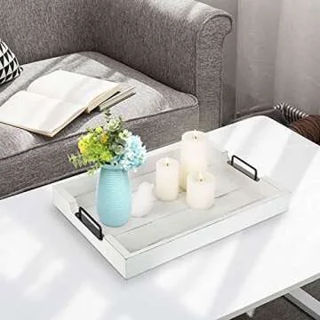 Show moreIntroducing the stunning MyGift 20 x 14 inch Vintage White Wood Serving Tray, a perfect blend of functionality and elegance tailored for any home setting. This exquisite rectangular tray showcases a charming vintage white finish that harmoniously complements a myriad of home decor styles while infusing a touch of rustic charm into your space. Crafted from durable wood, it assures longevity and resilience, making it a reliable choice for serving your favorite meals and beverages effortlessly. The sleek matte black metal handles not only add a stylish accent but also ensure a secure grip for comfortable transportation from the kitchen to the dining table.