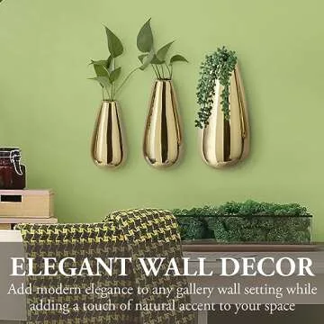 MyGift 3 Piece Set Wall Mounted Glossy Gold Tone Ceramic Teardrop Shape Plant Containers, Decorative Indoor Hanging Succulent Planter Pots Flower Vases