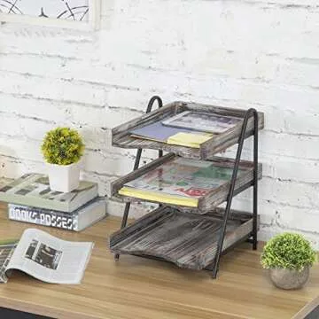 MyGift 3 Tier Rustic Torched Wood Letter Tray Desktop Organizer with Black Metal Stand, Office Desk Paper Document Sorter, Wooden Upright Filing Folder Rack