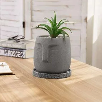Show more Introducing the MyGift 6-Inch Modern Grey Concrete Head Design Plant Pot, a striking addition to any indoor garden or home decor. This unique planter pot features an artistic head design that not only serves as a wonderful vessel for your favorite succulents and flowers but also doubles as a conversation starter in your living space. The modern grey concrete finish pairs beautifully with a speckled round saucer tray, ensuring that your plants have the perfect balance of style and practicality. This exquisite planter’s durability affords it longevity while remaining lightweight enough to relocate when necessary. Show off your green thumb without compromising on aesthetics!
