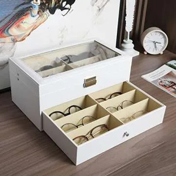 MyGift Deluxe White Wood Sunglasses Organizer, Eyewear Display Box, 2 Layer Storage Case with Glass Lid and Leatherette Trim, Holds up to 12 Pairs of Glasses