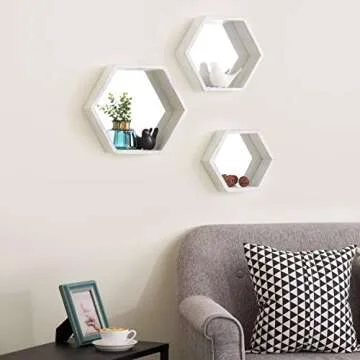 Show more Transform your living space with the MyGift Floating Shelves Wall Mounted Vintage White Wood Hexagon Display Shelf set. Perfect for blending vintage charm with modern aesthetics, these three hexagon-shaped shelves make an exquisite statement in any room. Crafted from high-quality wood with a stunning vintage white finish, these shelves support a range of decorative items from books to plants, showcasing them beautifully against their mirrored backing.