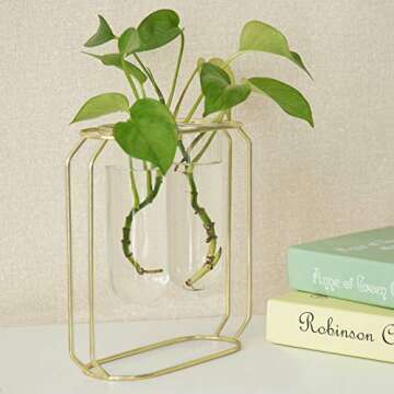 MyGift Glass Test Tube Vase with Geometric Gold Metal Frame Includes 2 Vases and Stand, Hanging Cylindrical Hydroponic Planter and Stand