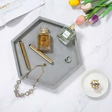Show moreAdd a touch of sophistication and luxury to your bathroom decor with the MyGift Modern Gray Concrete Hexagonal Decorative Display Bathroom Vanity Tray. This stunning vanity tray is not just a functional piece but also a work of art that elevates your space. Crafted from durable concrete and finished in a contemporary gray hue, this tray is the perfect blend of modern aesthetics and practical utility. It serves as an attractive backdrop for displaying your essentials — from toiletries to jewelry, candles to cosmetics, and even hand towels. The unique hexagonal shape adds an element of design flair, while the raised lip ensures that your items stay securely in place, making organization effortless and stylish.