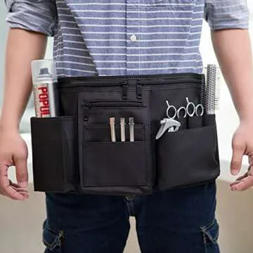 MyGift Professional Black Salon Apron, Makeup Artist Cosmetic Canvas Waist Apron, Multiple Pocket Brush Bag Organizer