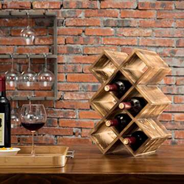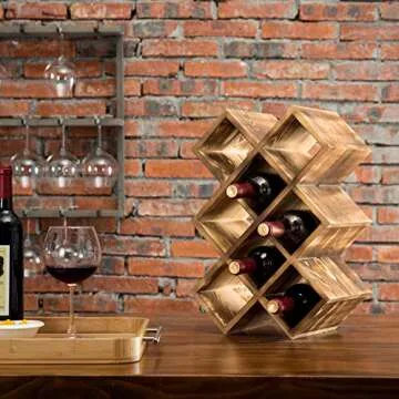 Show more Introducing the MyGift Rustic Brown Solid Wood Tabletop Wine Bottle Holder Rack—a perfect blend of functionality and aesthetics. This stylish wine rack boasts an impressive 8-bottle capacity, designed to elegantly hold your favorite wines while keeping them organized and easily accessible. Featuring a stunning geometric crosshatch design crafted from high-quality burnt natural solid wood, this rack enhances any décor from rustic to contemporary, making it an attractive addition to your home.