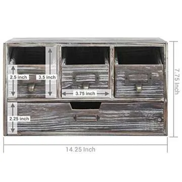 Show moreIntroducing the MyGift Rustic Torched Wood Desk Supplies Organizer Caddy - your ultimate solution for keeping all your essentials organized and easily accessible. Crafted with a charming rustic-style wood finish, this desktop storage cabinet brings warmth and character to your workspace. The burnished brass-tone metal handles add a touch of elegance, making it a truly stylish addition to any room. Designed with functionality in mind, the cabinet features four spacious drawers that provide ample storage for craft supplies, office essentials, classroom materials, or garage tools. Its compact dimensions (14.25 W X 7.75 H X 5.5 D) make it the perfect fit for even the smallest spaces, bringing organization without compromising on style.