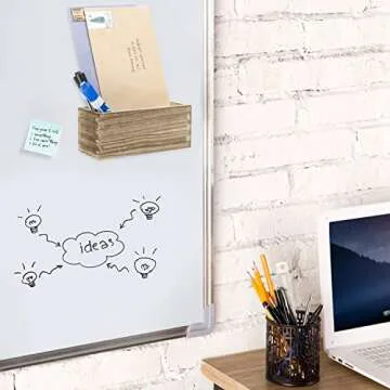 Show more Introducing the MyGift Rustic Torched Wood Magnetic Dry Erase Marker Holder set—a charming and practical solution to enhance your workspace organization. This set of three rectangle-shaped wooden containers is designed to hold your office supplies or dry erase accessories while adding a rustic touch to your decor. The natural wood finish creates a cozy aesthetic, making it a great addition to any home or office setting. With each bin measuring 2.5 inches in height, 6.0 inches in width, and 2.5 inches in depth, they are compact enough to fit in tight spaces while providing ample storage for your essentials.
