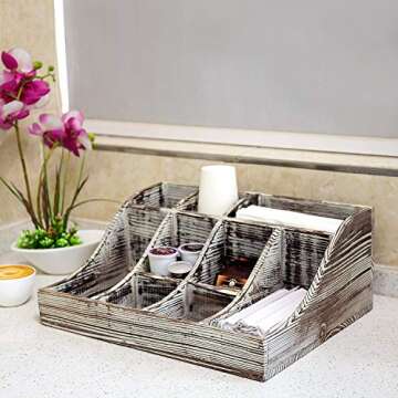 Rustic design condiment storage and organizer with a brown torched wood finish