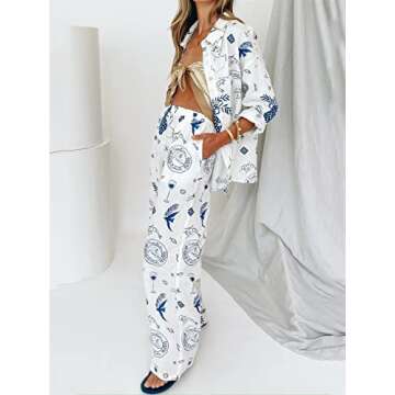 Discover the perfect blend of comfort and style with the Mylleure Women Y2K Printed 2 Piece Pants Set. This chic outfit features a long sleeve button-down shirt adorned with a stylish lapel collar and a fashionable v-neck design, paired seamlessly with high-waist wide-leg trousers. Made of breathable polyester and spandex, these pants are not only lightweight but also incredibly soft, providing the ultimate comfort for all-day wear. Whether you're strolling...