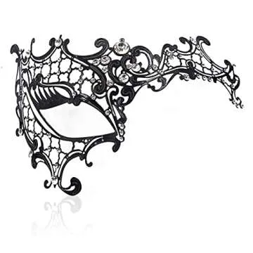 Our filigree masks dazzle with intricate designs adorned with sparkling rhinestone embellishments, capturing light beautifully and lifting your ensemble to new heights. Each piece is meticulously designed to offer a royal feel without breaking the bank; they scream sophistication and splendor! Featuring a rich jet-black finish, the mask feels light against your face and will not chip off, making it the perfect accessory for your next formal affair.