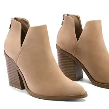 Show moreStep into sophistication with the mysoft Women's Ankle Boots Slip on Cutout Pointed Toe Chunky Stacked Mid Heel Booties. These ankle booties are not just an accessory, they are a style statement crafted to elevate your wardrobe. With a snug fit designed for all-day comfort, these boots feature a stylish side V cut that not only adds a fashionable flair but also elongates the appearance of your legs. The convenient back zipper allows for effortless on and off action, making them a go-to choice for those hectic days when you want to maintain an effortlessly chic look.