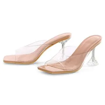 mysoft Women's Clear Heeled Sandals Square Toe Transparent Stiletto Mules Open Toe Slip on Dress Shoes