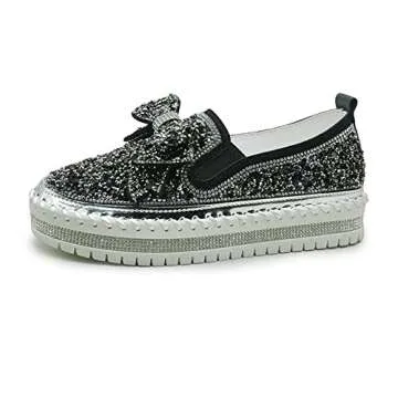 Show moreStep into elegance and comfort with the N AB Women's Casual Fashion Platform Rhinestones Glitter Slip On Sneakers. Designed for the modern woman, these chic sneakers effortlessly blend style and functionality. Made with a high-quality rubber sole and PU upper, they feature a unique intricate design with cute rhinestones and a chic bowknot that gives them an upscale look. Whether you are dressing up for an evening outing or seeking comfort for a day of shopping, these sneakers look stunning and are versatile enough to match various outfits. The breathable microfiber lining ensures a cozy fit, and the minimal heel height of approximately 1.18 inches provides just the right amount of lift without sacrificing comfort.