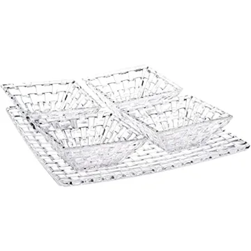 Show more Introducing the **Nachtmann Bossa Nova Plate & Bowl Set**, a stunning 5-piece serving ensemble that combines elegance with versatility. Crafted from premium lead-free crystal glass, this set exudes a brilliant clarity that catches the eye and elevates any dining experience. The contemporary square plate features a unique high-contrast woven pattern, making it a striking centerpiece for both casual luncheons and formal dinners. With its thoughtful design, this set includes one 11" square plate and four petite 3.6" bowls that are perfect for serving dipping sauces, desserts, chips, or an array of small dishes. Transform your table setting into a feast for the senses with this exquisite serveware collection that is as charming as it is functional.