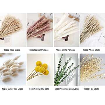 Show more Introducing the Nadong 100pcs Dried Pampas Grass Mix Bouquet, an exquisite collection that effortlessly enhances the decor of any space. This thoughtfully curated bouquet features 100 pieces of beautifully preserved dried plants, offering a range of 8 unique styles. Perfect for creating a warm, bohemian atmosphere in your home, office, or wedding setup, this natural pampas grass bouquet is not just visually appealing but is also a versatile addition to your decor arsenal. The seductive elegance of these dried flowers will elevate any setting while providing an enduring freshness that artificial flowers often lack.
