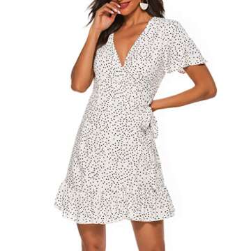 Naggoo Women's Sexy Deep V Neck Short Sleeve Wrap Ruffle Floral Printed Dress with Belt(L, White)