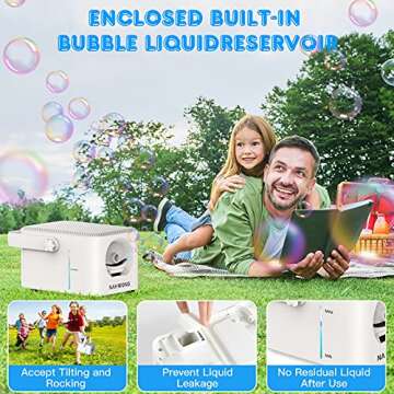 Show more Introducing the NAHWONG Bubble Machine, your ultimate partner in creating enchanting moments wherever you go! This bubble machine is designed with an innovative enclosed built-in reservoir that prevents spills and ensures hassle-free fun. Simply open the top cover, fill it with bubble liquid, and you’re ready to go! With a user-friendly built-in bubble blowing device, safety is prioritized—no risk of unintentional spills or injuries. This means endless hours of joyful play for your little ones!