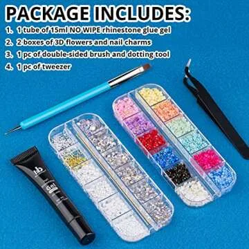 Show more Transform your nail art game with our fabulous 15ml tube design NO WIPE rhinestone gel glue set! This comprehensive package includes everything you need to create stunning nail designs right at home. Each set comes with 2 boxes of 3D nail charm decorations, showcasing a delightful assortment of colorful 3D flowers, tiny beads, and dazzling AB gems. Not to mention, you'll also receive the ever-handy dual-end dotting pen and brush, along with precision tweezers to enhance your nail design experience.