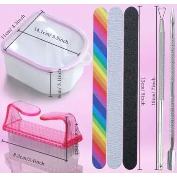 Show more Introducing the ultimate Nail Soak Off Bowl Set, a must-have for anyone who enjoys at-home manicures or requires a professional touch! This comprehensive set includes 2 soaking bowls, a 100/180 grit nail file, a grit nail buffer, a triangle cuticle peeler scraper, a double-ended nail pusher, and a nail brush, ensuring you have everything needed for a complete nail care experience. Made from high-quality PVC material, these bowls are both durable and comfortable to use, with a smooth surface that enhances the soaking process.