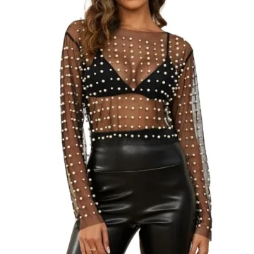 Naileksi Women Pearl Rhinestone Sheer Mesh Crop Top - Long Sleeve Slim Fit