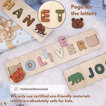 The name puzzle is made from high-quality wood and painted with water-based children's paint for safety.