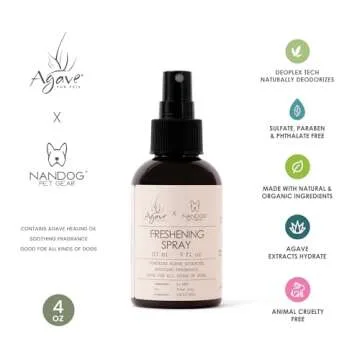 Show moreIntroducing the NANDOG & Agave for Pets Freshening Spray, a revolutionary plant-based odor neutralizer designed specifically for your beloved dogs. This innovative formula, available in a convenient 4 oz bottle, utilizes Deo-Plex Technology to tackle unpleasant smells effectively. Unlike conventional sprays that rely on harsh chemicals, this freshening spray harnesses the power of advanced fermentation and natural vegetable feedstock to safely eliminate odors, leaving your pet’s coat not only smelling clean but also radiant with a long-lasting fresh scent.