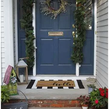Show more Step into style and elegance with our stunning oversized black and white rug that redefines outdoor and indoor décor. Made from premium quality materials, this rug boasts a resilient design that withstands outdoor elements while retaining its vibrant color. At an impressive size of 28” x 43”, it's perfect for layering over door mats, allowing you to create an Instagram-ready look for your porch or entryway. Pair it with a cheerful 'hello' doormat for the ultimate welcoming vibe!