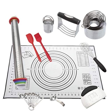 Show more Introducing the NASNAIOLL 11 Pcs Baking Set, a comprehensive collection for both novice and experienced bakers that elevates your culinary experience. This premium baking kit includes everything you need to create perfect pastries, cookies, and more. The set features a durable adjustable rolling pin with clear "inches/cm" measurements, a versatile silicone baking mat, a high-quality dough cutter, and multiple useful accessories such as spatulas, a whisk, and an egg separator. Every element in this set is crafted from high-quality stainless steel, silicone, and PP plastic, making them heat-resistant and completely dishwasher safe. Say goodbye to hand and wrist fatigue, thanks to the ergonomic rubber grip that ensures comfort during extended use. With this kit, you can easily adjust the thickness of your dough, making it an indispensable tool for your kitchen.
